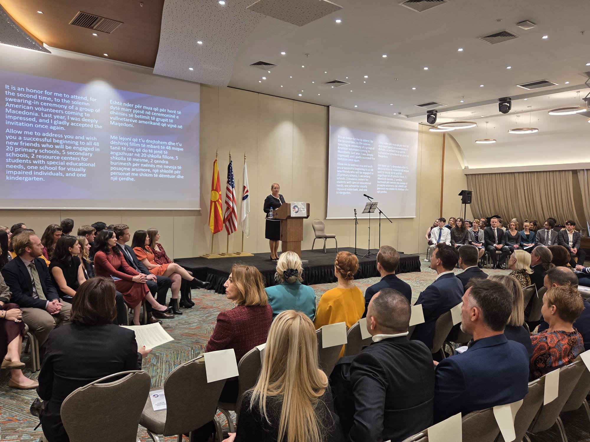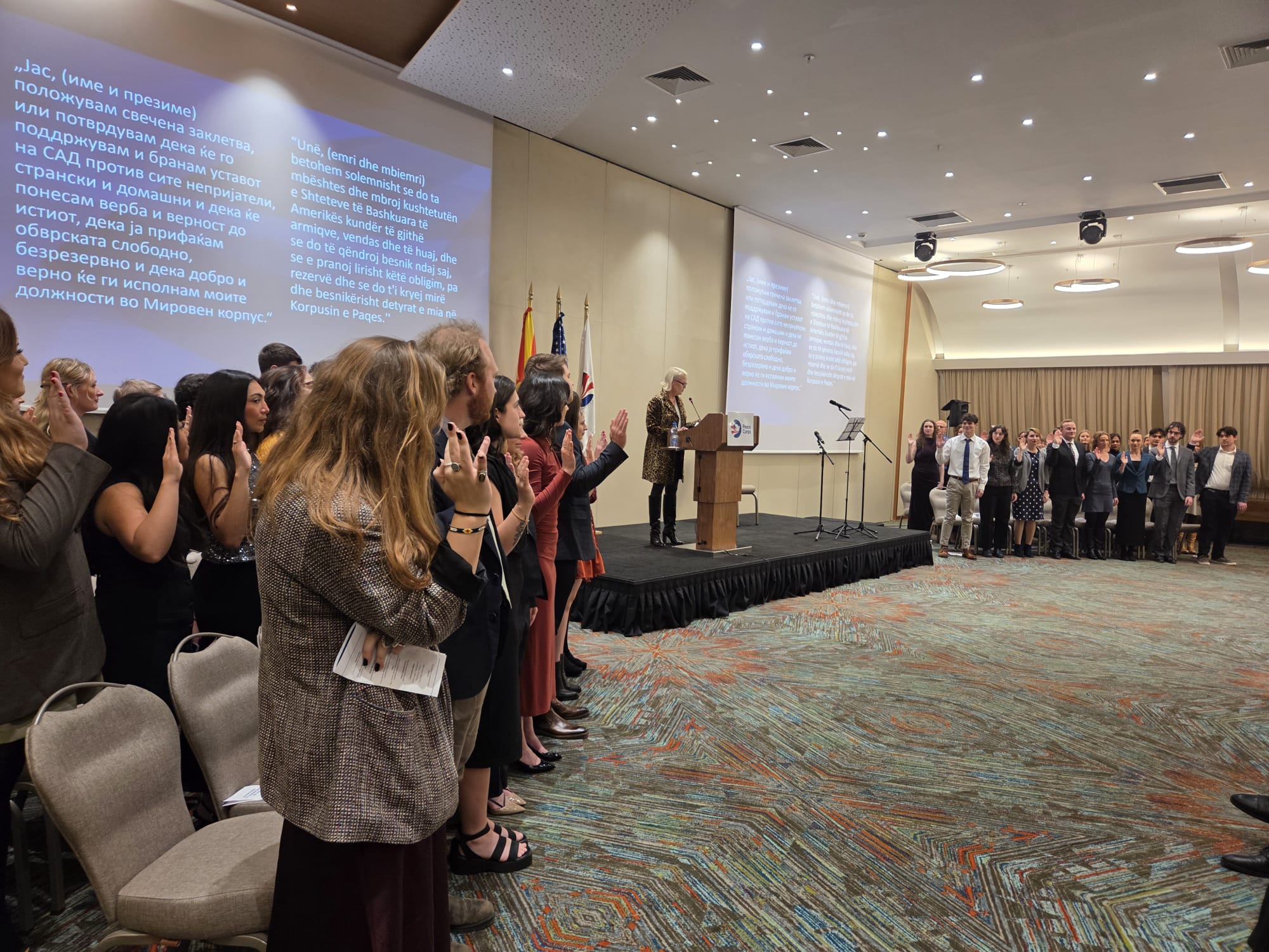 Нова група 48 американски волонтери на Мировниот корпус во следните две години ќе биде ангажирана во училишта во Македонија и ќе помага за јакнење на јазичните вештини на учениците и за развојот на поинклузивна училишна средина. Волонтерите денес дадоа свечена заклетва во присуство на претседателката на државата проф. д-р Гордана Сиљановска Давкова, министрите за образование и наука и за локална самоуправа проф. д-р Весна Јаневска и Златко Перински, американската амбасадорка Анџела Агелер, директорот на Мировниот корпус, Дејвид Рисајд, повеќе градоначалници и училишни директори.